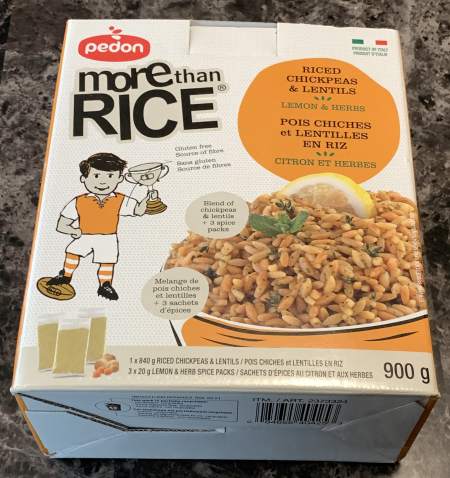 You get a 900-gram box of the riced chickpeas & lentils for $10.79 Canadian. This includes one large 840-gram bag of riced chickpeas & lentils and three 20 gram spice packets.
