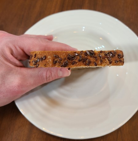 This bread isn’t gluten-free, it contains wheat. It also has flax seeds and sunflower seeds for a bit of a nutritional boost. Sunflower seeds are loaded with Vitamin E and flax seeds are a source of protein.