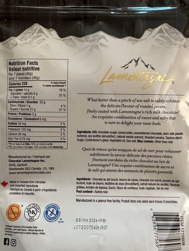 Has anyone ever had the Kirkland Signature Macadamia Nut Clusters? Those were a favorite of ours because they reminded us of elevated Turtles but we never saw them at Costco this year around Christmas. I’ve been trying all different kinds of chocolates from Costco in hopes I’d find something just as good so I picked these milk chocolate pecans by Lamontagne up on my last trip.