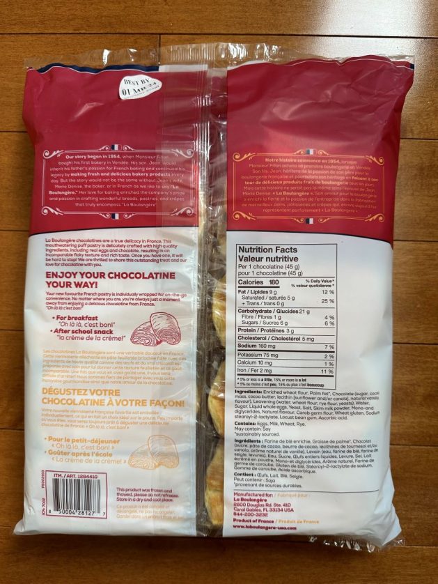 One chocolatine contains 180 calories, nine grams of fat, 21 grams of carbohydrates, one gram of fibre, six grams of sugar, three grams of protein and 160 milligrams of sodium. The ingredients list doesn’t really have anything nutritious and I don’t love that palm fat is the second ingredient.