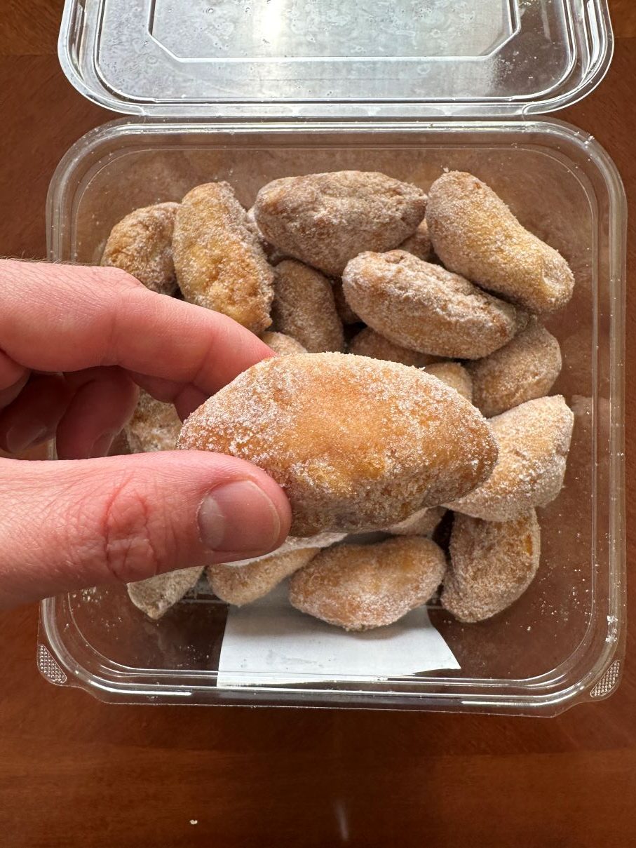 They taste pretty much like I expected after seeing them with the lid off- like cheap, super processed grocery store donuts. They’re kind of cakey and moist, though I think that might be more from the amount of grease (lard) in them than an intentional choice. They’re quite sweet from the sugar, but there’s another weird flavor in there. I think it’s the lard. Overall these donuts aren’t horrible, but they’re pretty bad.