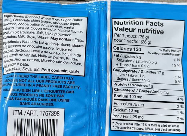 One packet of cookies has 130 calories, six grams of fat, 17 grams of carbohydrates, one gram of fibre, nine grams of sugar, one gram of protein and 100 milligrams of sodium. The ingredients list is pretty typical for a packaged, crispy cookie. The cookies contain wheat, soy and milk and may contain eggs.