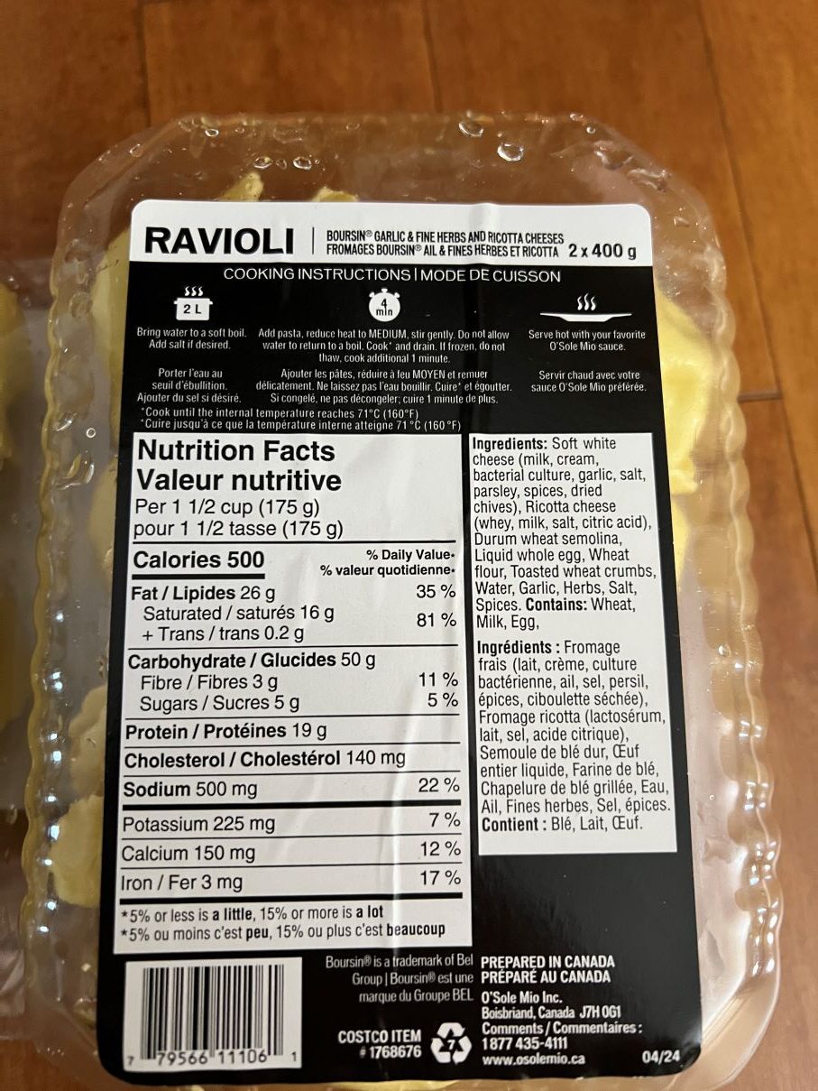 A 1 1/2 cup serving contains 500 calories, 26 grams of fat, 50 grams of carbohydrates, three grams of fibre, five grams of sugar, 19 grams of protein and 500 milligrams of sodium. The ingredients list is pretty short and sweet, the ravioli contains wheat, milk and egg.