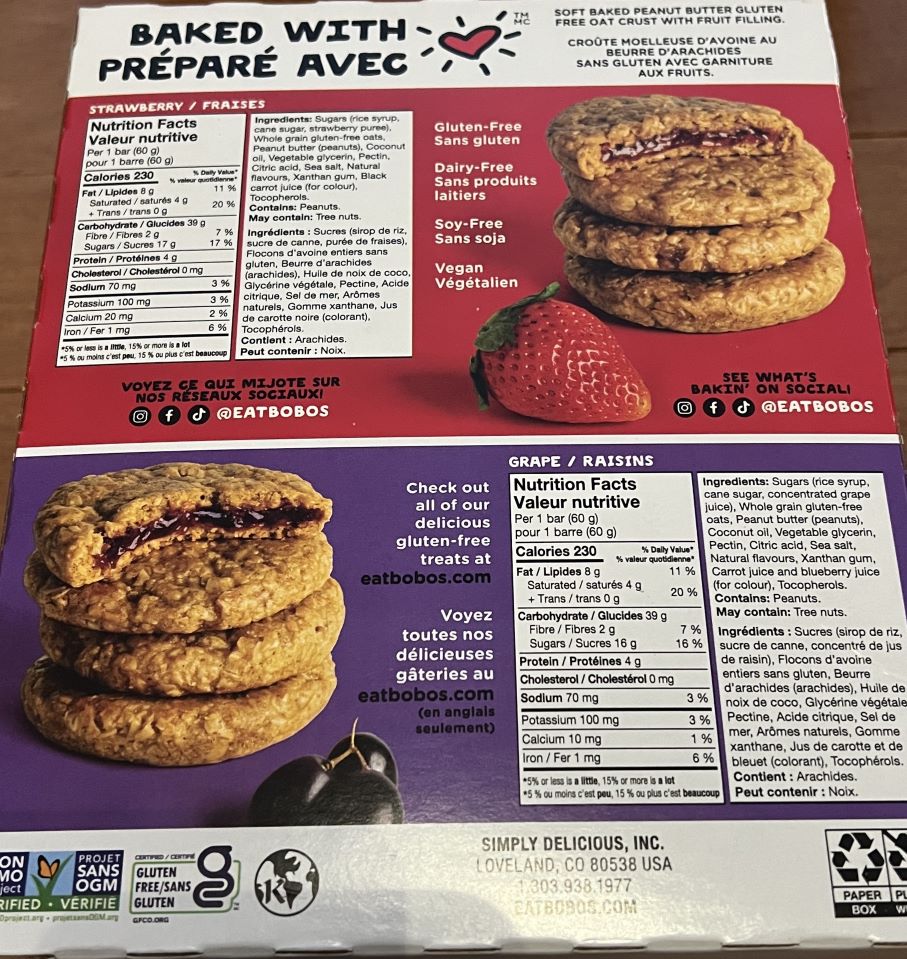 The oat bars have 230 calories, eight grams of fat, 39 grams of carbohydrates, two grams of fibre and 16 to 17 grams of sugar. The ingredients list has sugar as the first ingredient listed for both flavors. Other than that there’s mainly just peanut butter, oats and coconut oil with a few other ingredients.