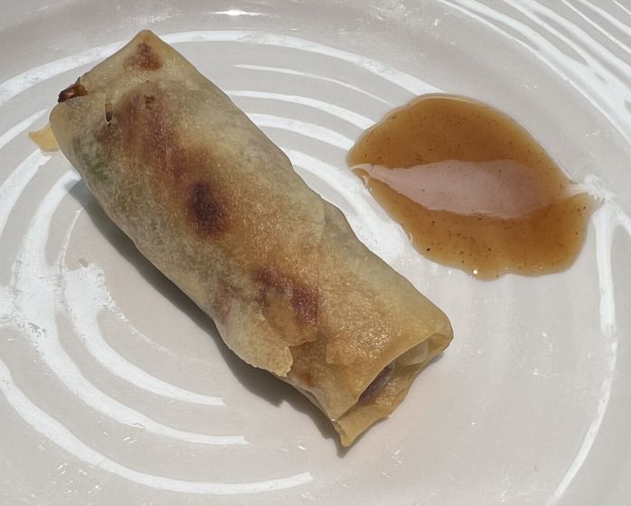 The spring rolls contain jicama, carrot, cabbage, sweet potato, edamame, bamboo shoots, onion and leeks. They contain soy and wheat but are vegetarian and vegan.