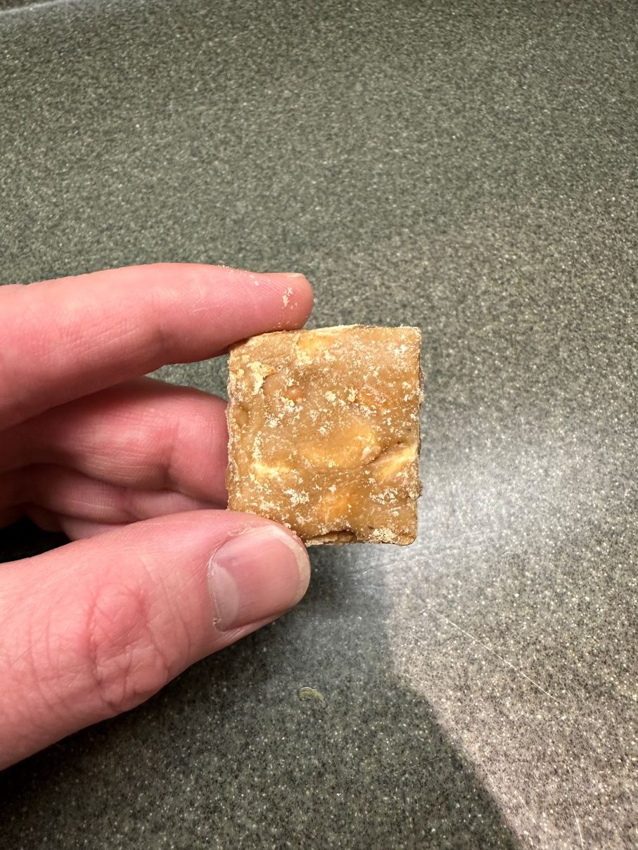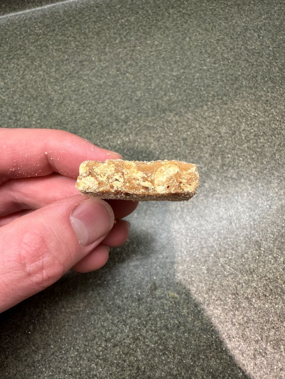 The first thing I noticed is that this tasted less peanuty than I expected! There are real peanuts in it but it’s not super peanuty, you get more of the buttery-caramel flavor that’s sweet and rich. The texture is really hard so be careful with your teeth! The brittle is pretty sweet but not over-the-top sweet. I think if you like peanut brittle, you’ll enjoy.