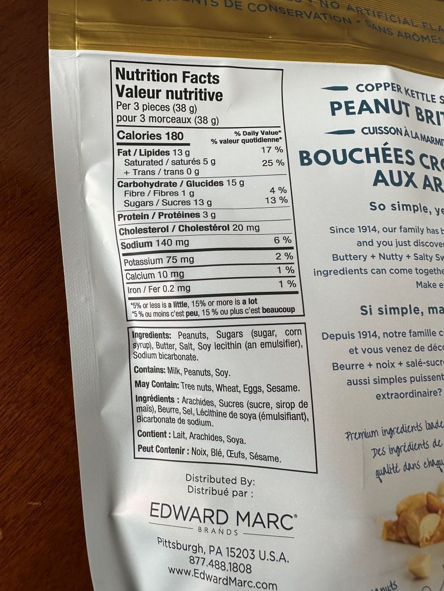 In three pieces of brittle there are 180 calories, 13 grams of fat, 15 grams of carbohydrates, one gram of fibre, 13 grams of sugar, three grams of protein and 140 milligrams of sodium. The ingredients list is really short with peanuts, sugar and butter being the main ingredients. This is gluten-free.