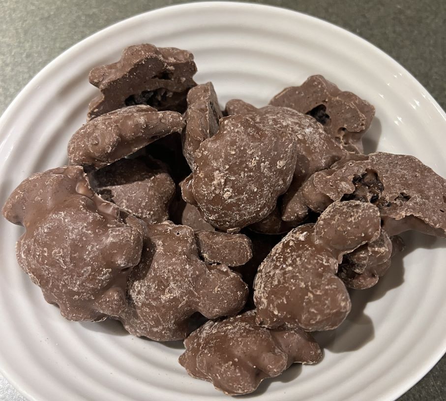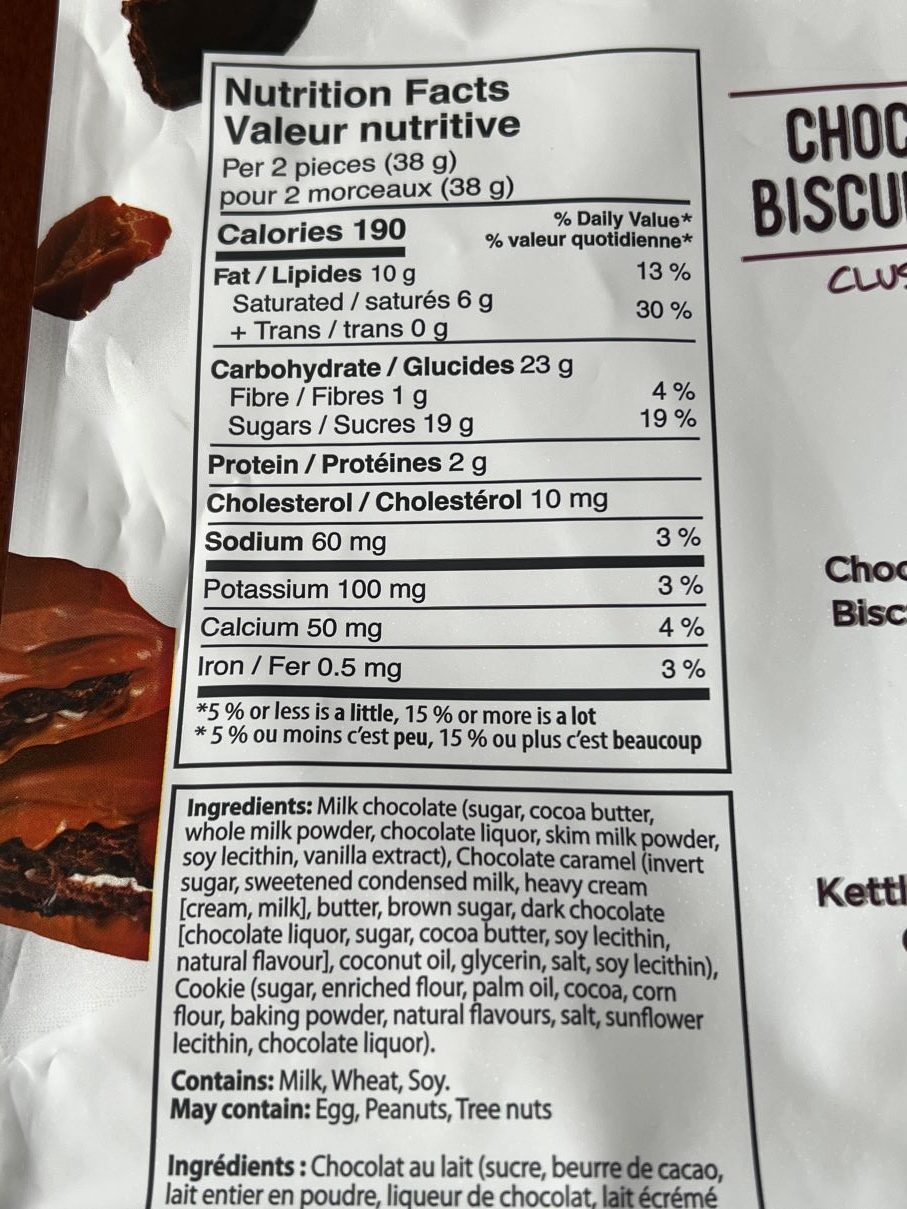 The clusters are not low-cal but the nutrition facts are similar to Turtles or the Macadamia Clusters from Costco. In two clusters there are 190 calories, 10 grams of fat, 23 grams of carbohydrates, one gram of fibre, 19 grams of sugar, two grams of protein and 60 milligrams of sodium. The clusters have wheat and soy in them and may contain egg, peanuts and tree nuts.