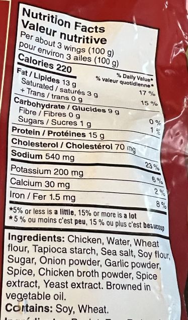 In three wings there are 220 calories, 13 grams of fat, nine grams of carbohydrates, zero grams of fibre, one gram of sugar, 15 grams of protein and 540 milligrams of sodium. Considering how much breading it looks like are on each wing the carbs aren’t that high! The ingredients list is also pretty short and sweet with chicken being the first ingredient!