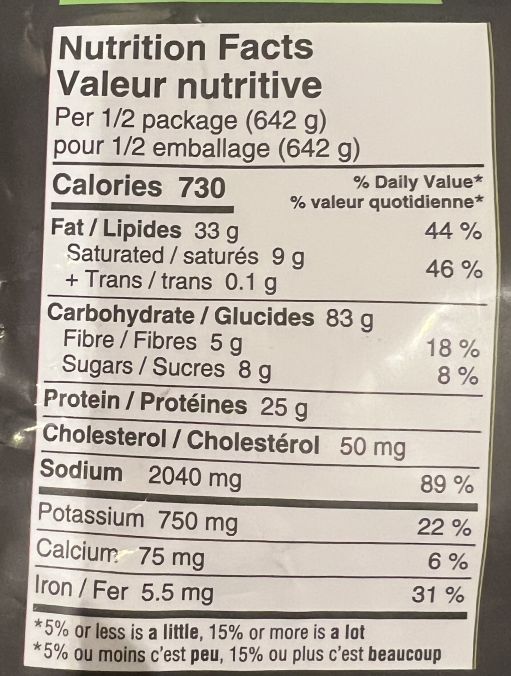 In half of the package there’s 730 calories, 33 grams of fat, 83 grams of carbohydrates, five grams of fibre, eight grams of sugar, 25 grams of protein and 2040 milligrams of sodium. That’s soooo much sodium but it is for half the package so if you eat 1/4 of the package it’s not as bad. The carbs are also high as well if you’re avoiding lots of carbs.