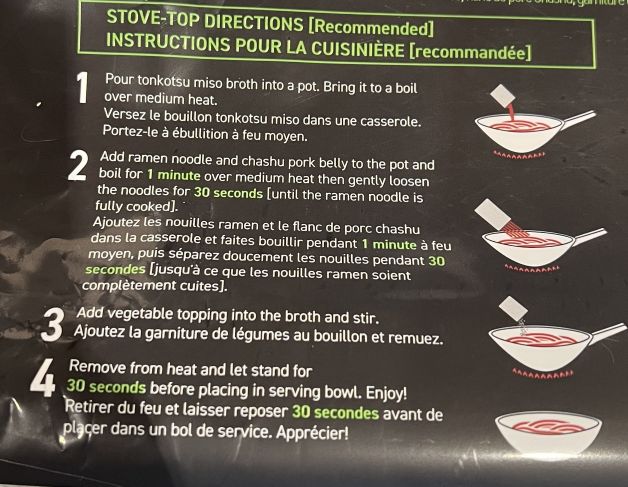 The ramen has a best before date that’s about four weeks from when I purchased it and needs to be kept refrigerated. You could maybe freeze it if you weren’t going to use it by the best before date but I’m not sure if that would change the texture or flavor of the ingredients. There’s pork belly, broth, dried vegetables and ramen noodles in the package.