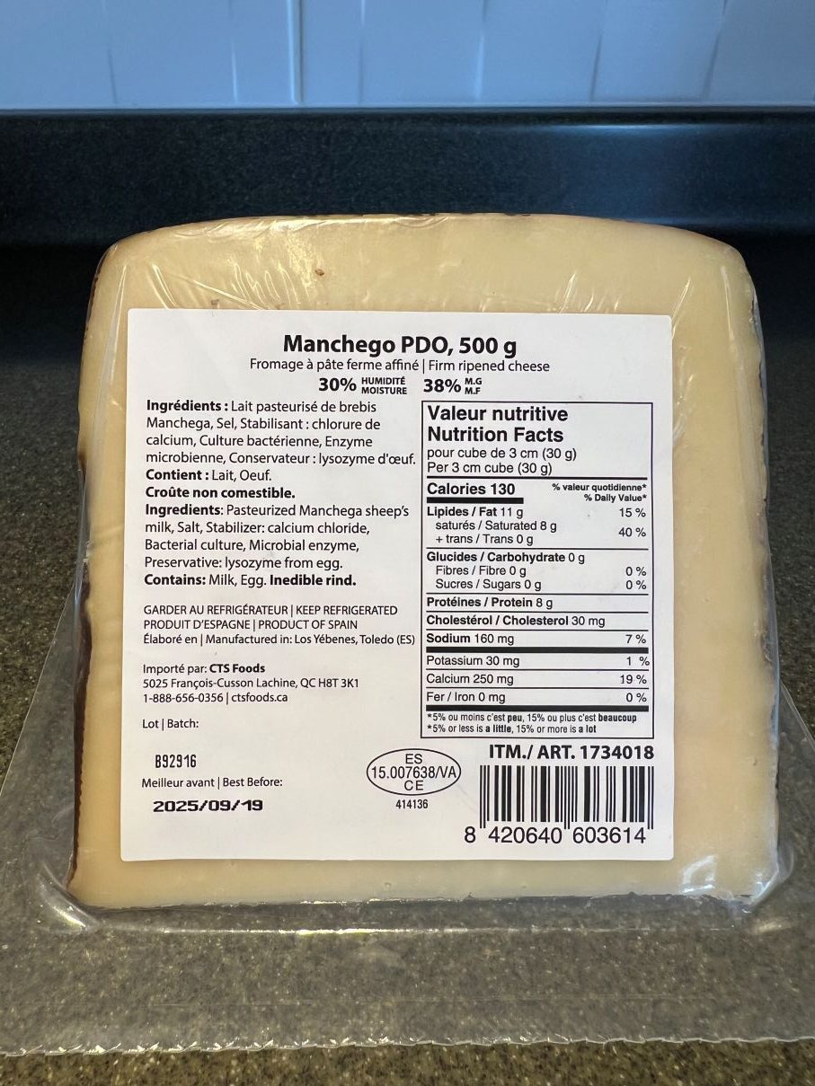 One three centimeter cube has 130 calories, 11 grams of fat, zero grams of carbohydrates, zero grams of fibre, zero grams of sugar, eight grams of protein and 160 milligrams of sodium. The ingredients list is pretty short and if you weren’t already aware, Manchego is made from Sheep’s milk.