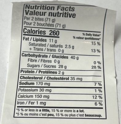 There are 260 calories, 11 grams of fat, 40 grams of carbohydrates, zero grams of fiber, 28 grams of sugar, two grams of protein and 170 milligrams of sodium. The bites don’t have any peanuts listed in the ingredients but it says they may contain tree nuts.