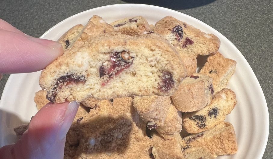 The cookies are quite nice! They remind me of biscotti or a hard shortbread. They’re sweet but not too sweet and are pretty crunchy and flavorful. Because they’re a bit hard kids might find them a bit difficult to eat bite but they’d be easy to eat if they’re dunked in milk, coffee or tea. The cherry flavor is quite noticeable and pretty tasty throughout the cookie. You get a ton of fruity flavor if you have a bite with dried cranberries or cherries. The white chips aren’t too noticeable but add a bit of sweetness. I have zero complaints about these small biscotti looking cookies!
