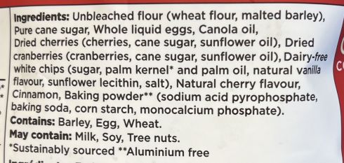 The ingredients list isn’t full of healthy ingredients, but there are real cherries and cranberries in the cookies. The cookies contain barley, egg and wheat and may contain milk, soy and tree nuts.