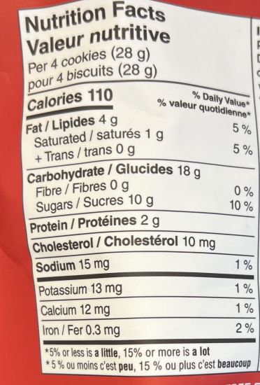 Four cookies contains 110 calories, four grams of fat, 18 grams of carbohydrates, zero grams of fibre, 10 grams of sugar, two grams of protein and 15 milligrams of sodium.