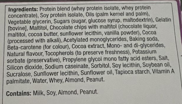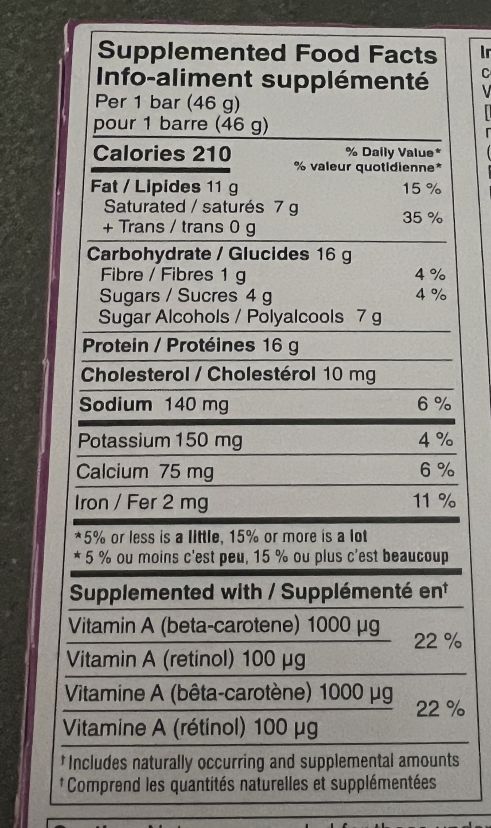 One bar contains 210 calories, 11 grams of fat, 16 grams of carbohydrates, one gram of fibre, four grams of sugar, seven grams of sugar alcohol, 16 grams of protein and 140 milligrams of sodium.
