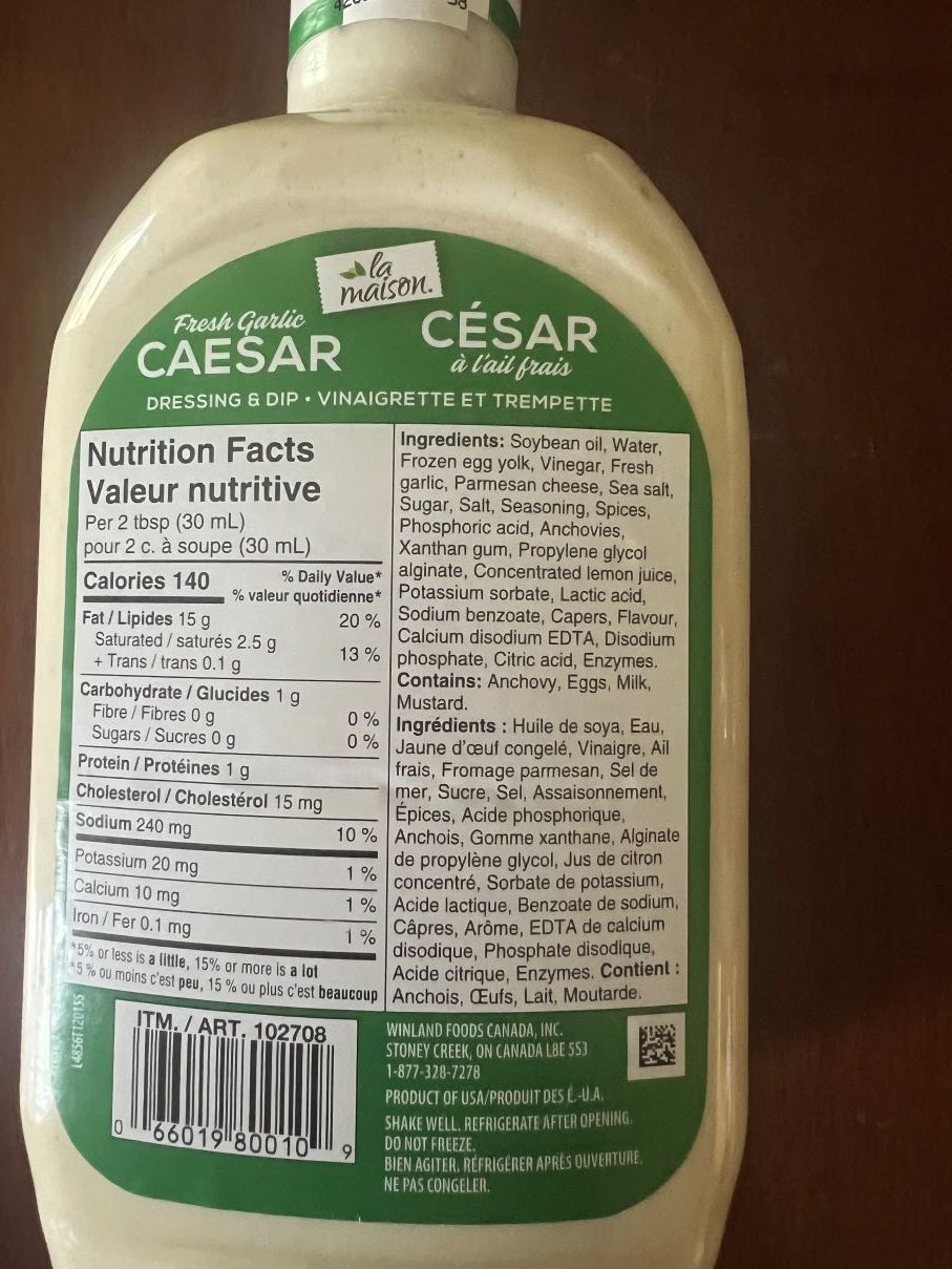 Two tablespoons of dressing/dip contains 140 calories, 15 grams of fat, one gram of carbohydrates, zero grams of fibre, zero grams of sugar and 240 milligrams of sodium. This is definitely not a low fat/low calorie salad dressing. The ingredients list is pretty typical for a store-bought salad dressing, I don’t love seeing soybean oil as the oil used. I try to make my salad dressings at home with avocado or olive oil.