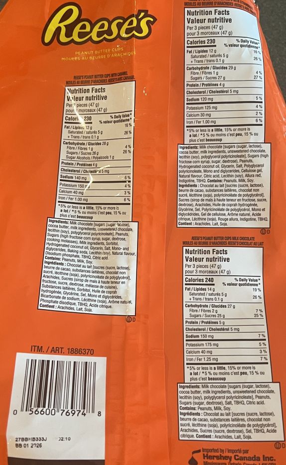 The nutrition facts for each peanut cup vary depending on the flavor but don’t differ greatly. For three peanut butter cups you’re look at 230-240 calories and 26 to 27 grams of sugar. The ingredients list has all the unhealthy things you’d expect to see, like high fructose corn syrup.