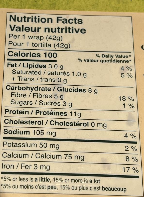 One wrap contains 100 calories, three grams of fat, eight grams of carbohydrates, five grams of fibre, three grams of sugar, 11 grams of protein and 105 milligrams of sodium. Those are pretty awesome nutrition facts for a tortilla! The 11 grams of protein is great. The tortillas aren’t the “cleanest” despite being gluten-free and dairy-free.