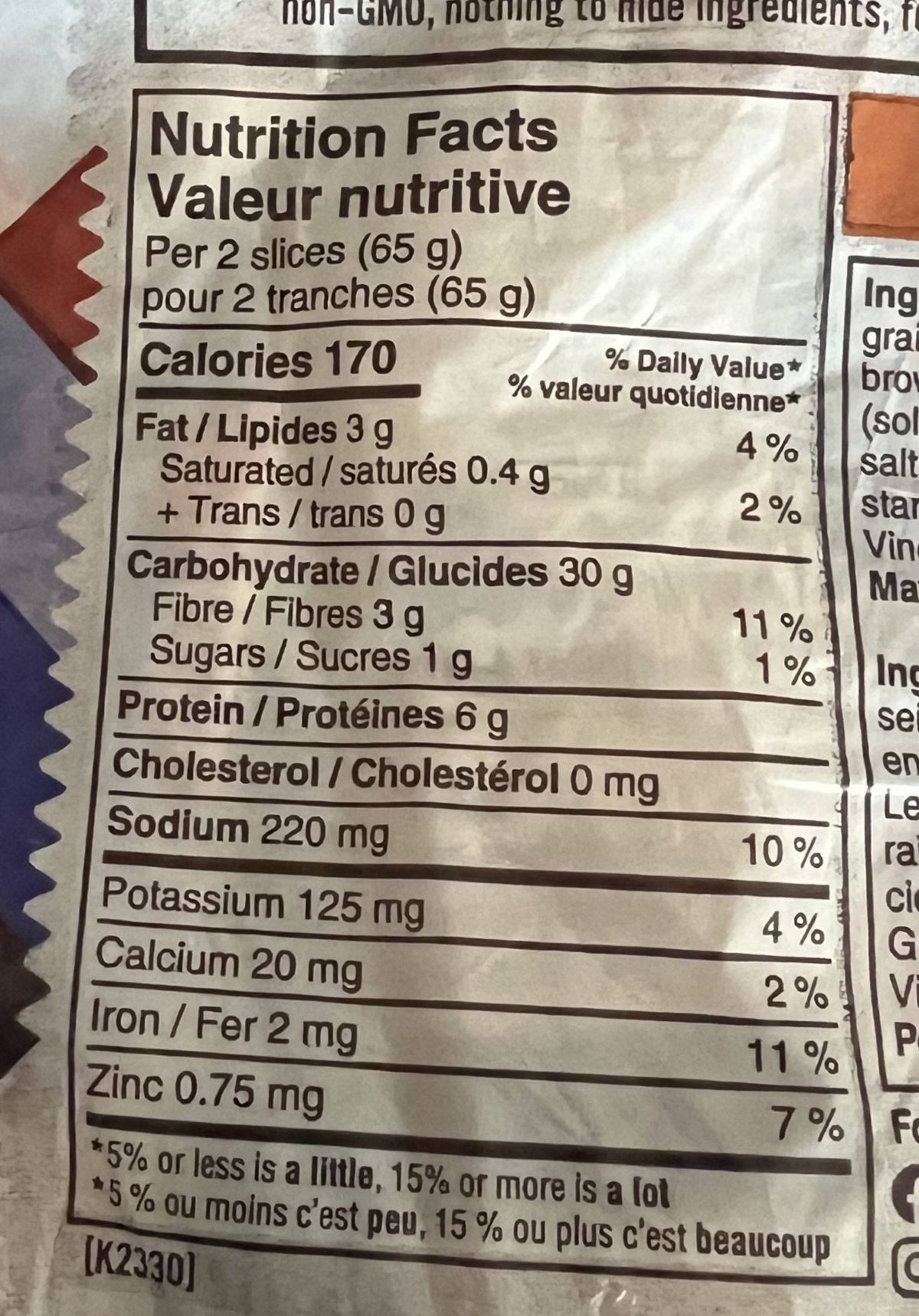 In two slices there are 170 calories, three grams of fat, 30 grams of carbohydrates, three grams of fibre, one gram of sugar, six grams of protein and 220 milligrams of sodium. I love the simple ingredients list as well!