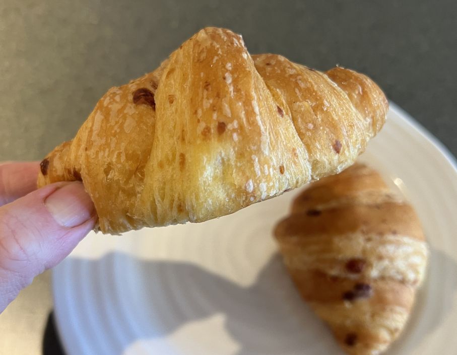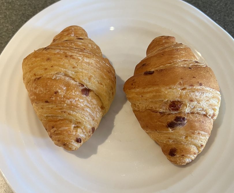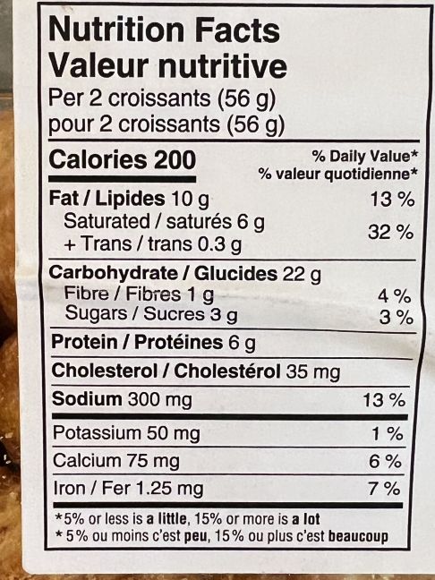 In two croissants there are 200 calories, 10 grams of fat, 22 grams of carbohydrates, one gram of fibre, three grams of sugar, six grams of protein and 300 milligrams of sodium. One croissant is 100 calories and five grams of fat which isn’t bad! The ingredients list is also pretty short and simple.