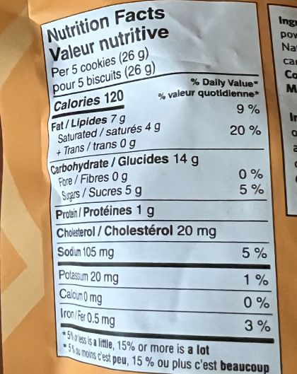 In five cookies there are 120 calories, seven grams of fat, 14 grams of carbohydrates, zero grams of fibre, five grams of sugar, one gram of protein and 105 milligrams of sodium. The ingredients list is pretty short and and I really like that these shortbread cookies have butter.