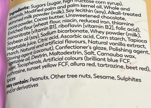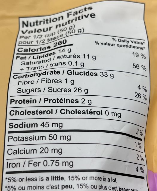 A half cup serving has 260 calories, 14 grams of fat, 33 grams of carbohydrates, one gram of fibre, 26 grams of sugar, two grams of protein and 45 milligrams of sodium. The ingredients list unfortunately has artificial colors and flavors and may contain peanuts, other tree nuts, sesame, sulphites.