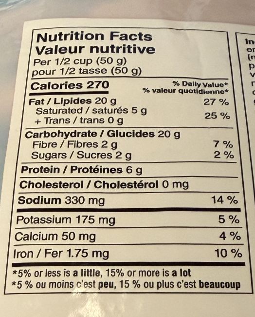 There are 270 calories, 20 grams of fat, 20 grams of carbohydrates, two grams of fibre, two grams of sugar, six grams of protein and 330 milligrams of sodium in a half cup in serving. It’s really easy to eat way more than half a cup, a half a cup isn’t really that much when you’re distracted by a movie or board game or conversation!