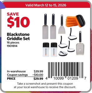 Costco did release some online coupons for this weekend only.  The Blackstone Griddle Set looks like a great deal if you are looking for some branded Blackstone Gear.  You will need to show the coupon at the cashier, but you can just show them the photo from this site.