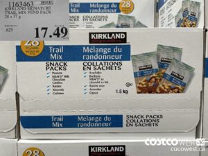 1163463 KIRKLAND SIGNATURE TRAIL MIX VEND PACK 28 x 57 g Posted Savings Expiry Price 2021-05-10 $17.49 2020-08-18 $19.99 2018-10-09 $19.99